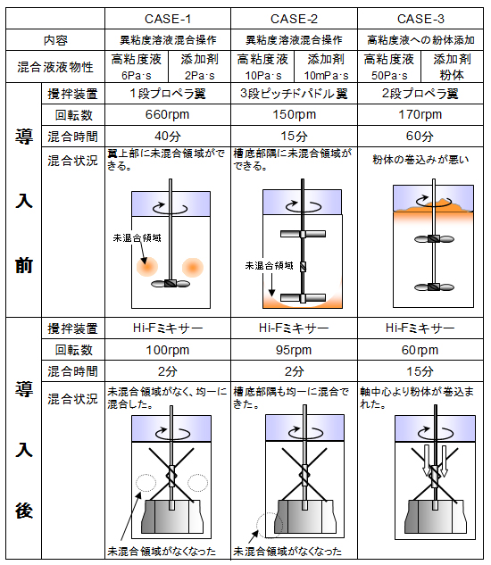 Hi-Fミキサーは、従来翼に比べて非常に短時間で混合が完了します。しかも、低速回転でも高い混合性能が得られるため、泡の巻き込みも低減します。